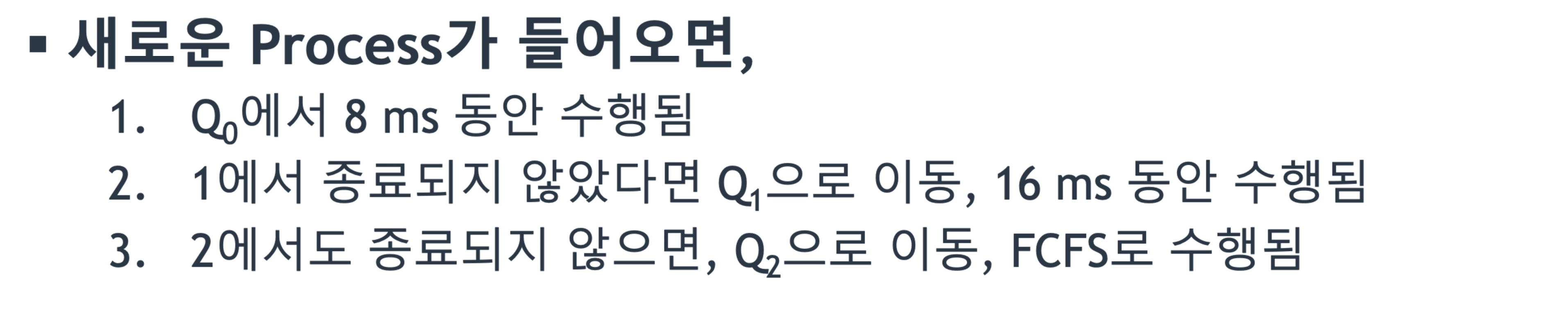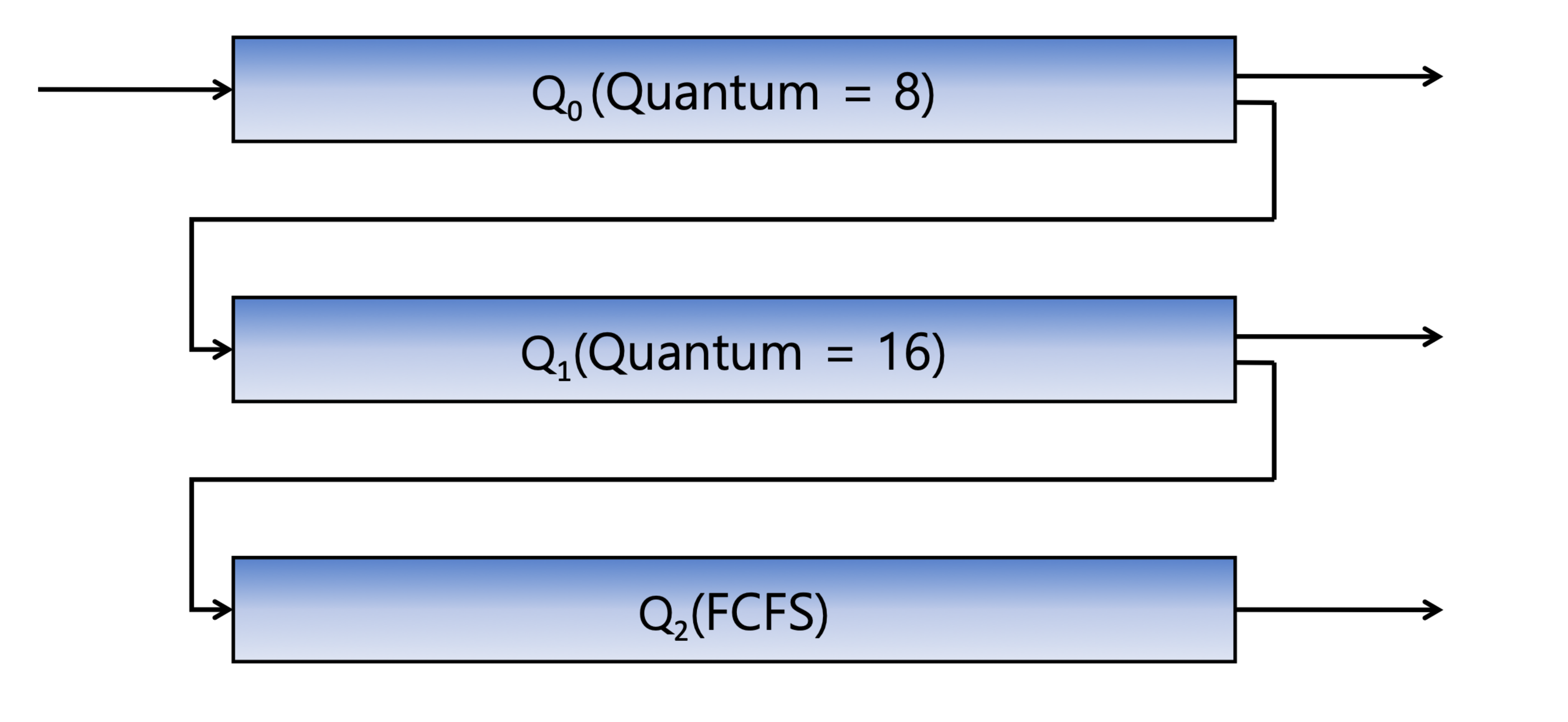 즉, 생성되고 8 + 16ms 동안 종료되지 않은 Process는 많은 CPU작업을 필요로 하는 Process로 간주하여 FCFS기법을 이용해 충분한 CPU Time을 할당해주는 Scheduling 방법이다.