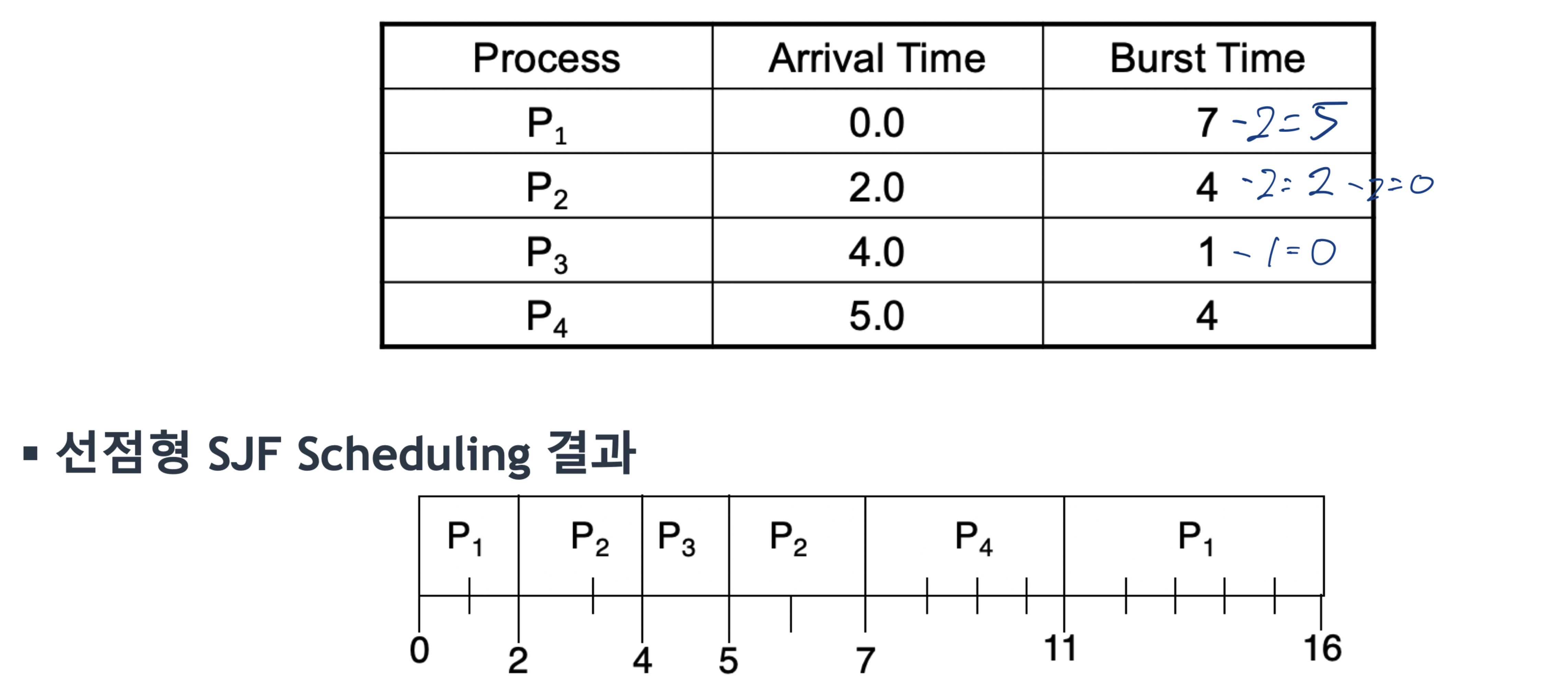 - CPU를 할당 받아 수행 중이더라도 CPU Burst Time이 자신의 현재 남은 시간보다 짧은 시간을 가진 프로세스가 새로 생성되면 CPU를 양보한다.