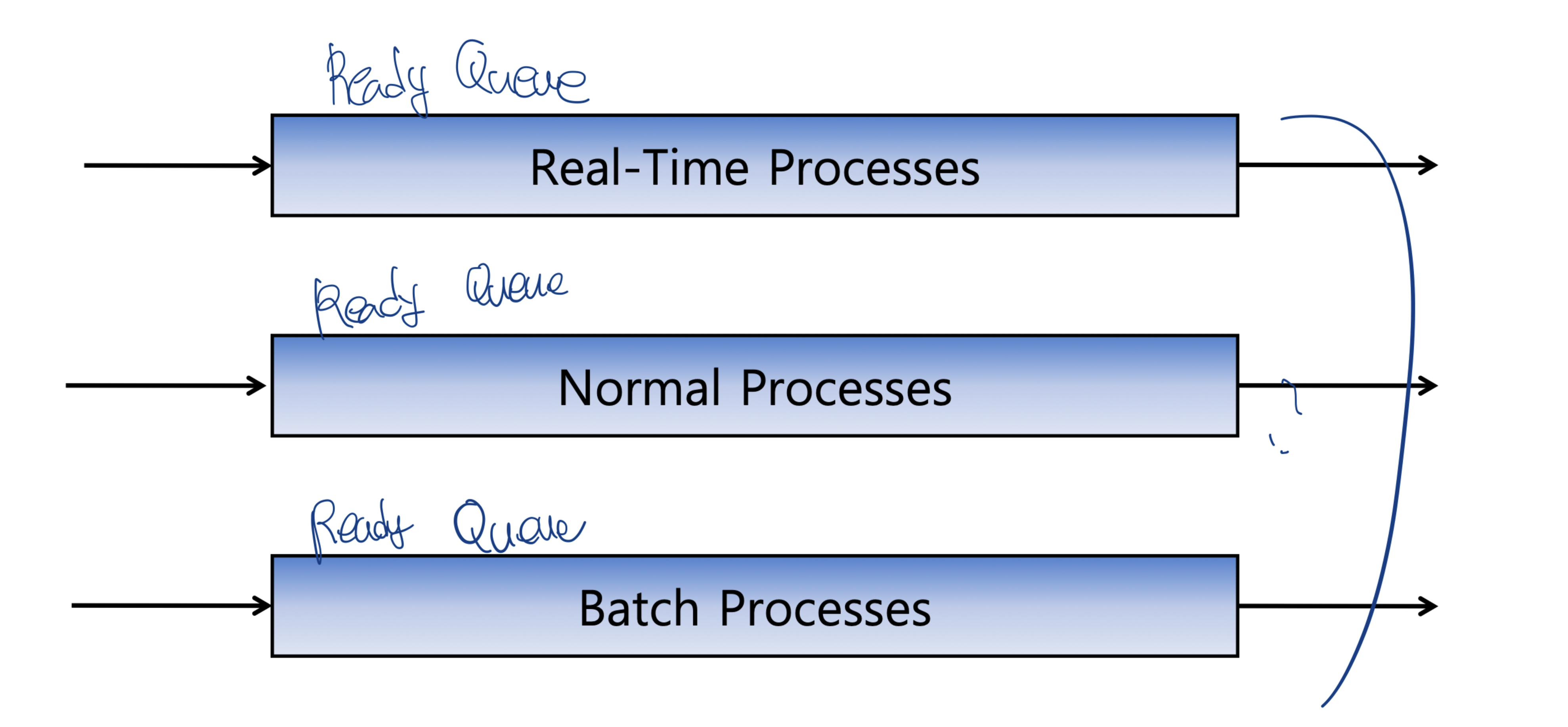 Ready Queue를 여러 개의 Queue로 분리하여, 각각에 대해 다른 Sceduling Algorithm을 사용하는 기법
