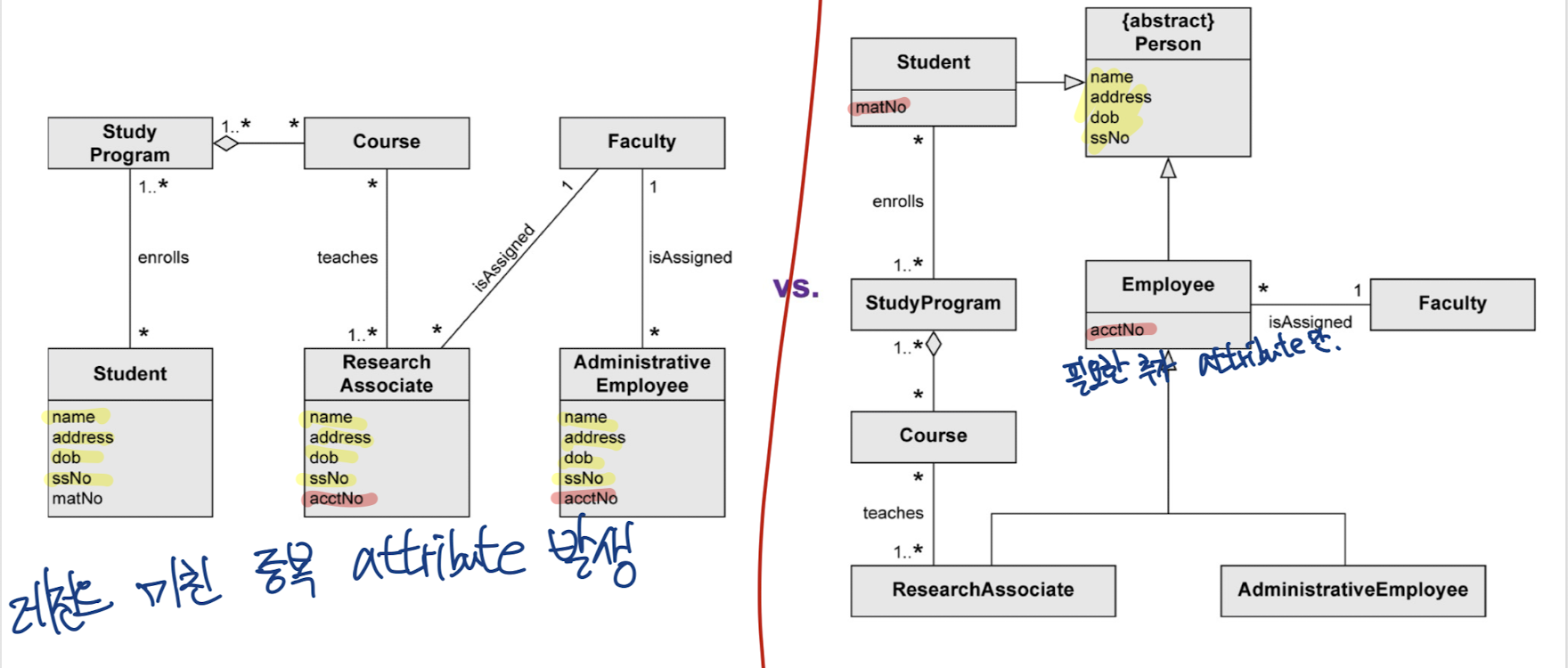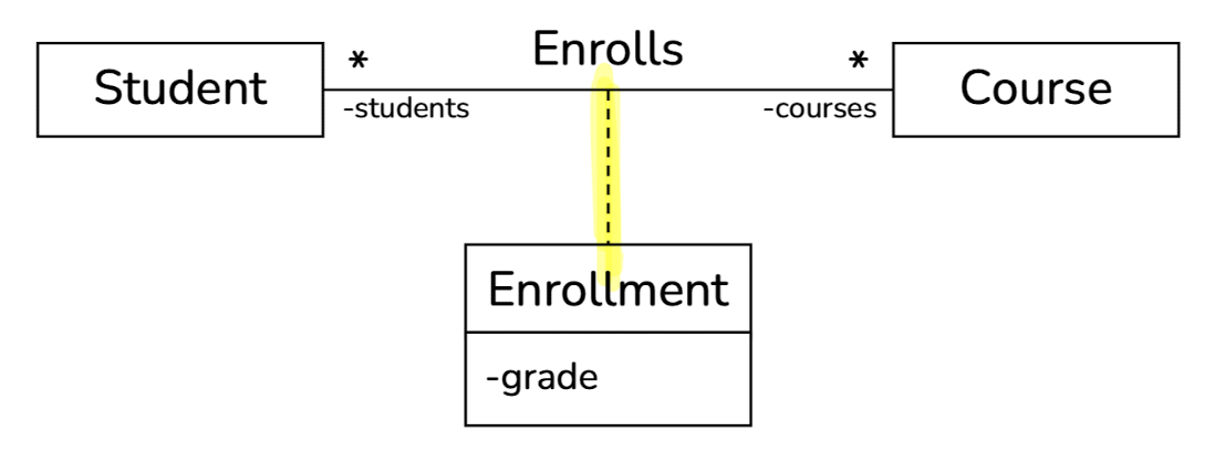Enrolls에 해당하는 association에 대해 클래스로 표현하고, 이 클래스에 grade를 추가 (이를 연관 클래스라고 함)
