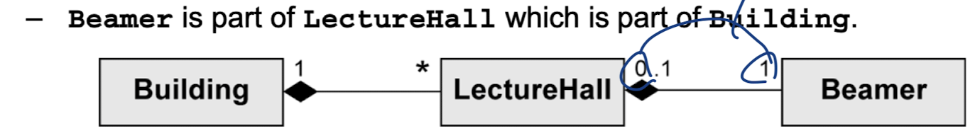 위 그림의 Multiplicity를 보면 LectureHall이 없어도(0) Beamer는 존재할 수 있다. 하지만, Lecturehall과 합성 관계이기 때문에 LectureHall 객체가 삭제되면 Beamer 객체 역시 사라진다.