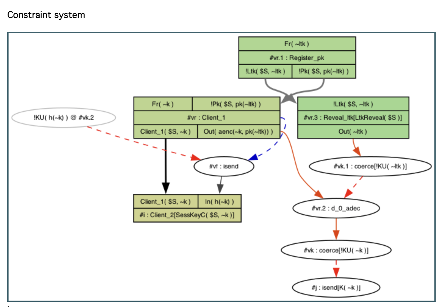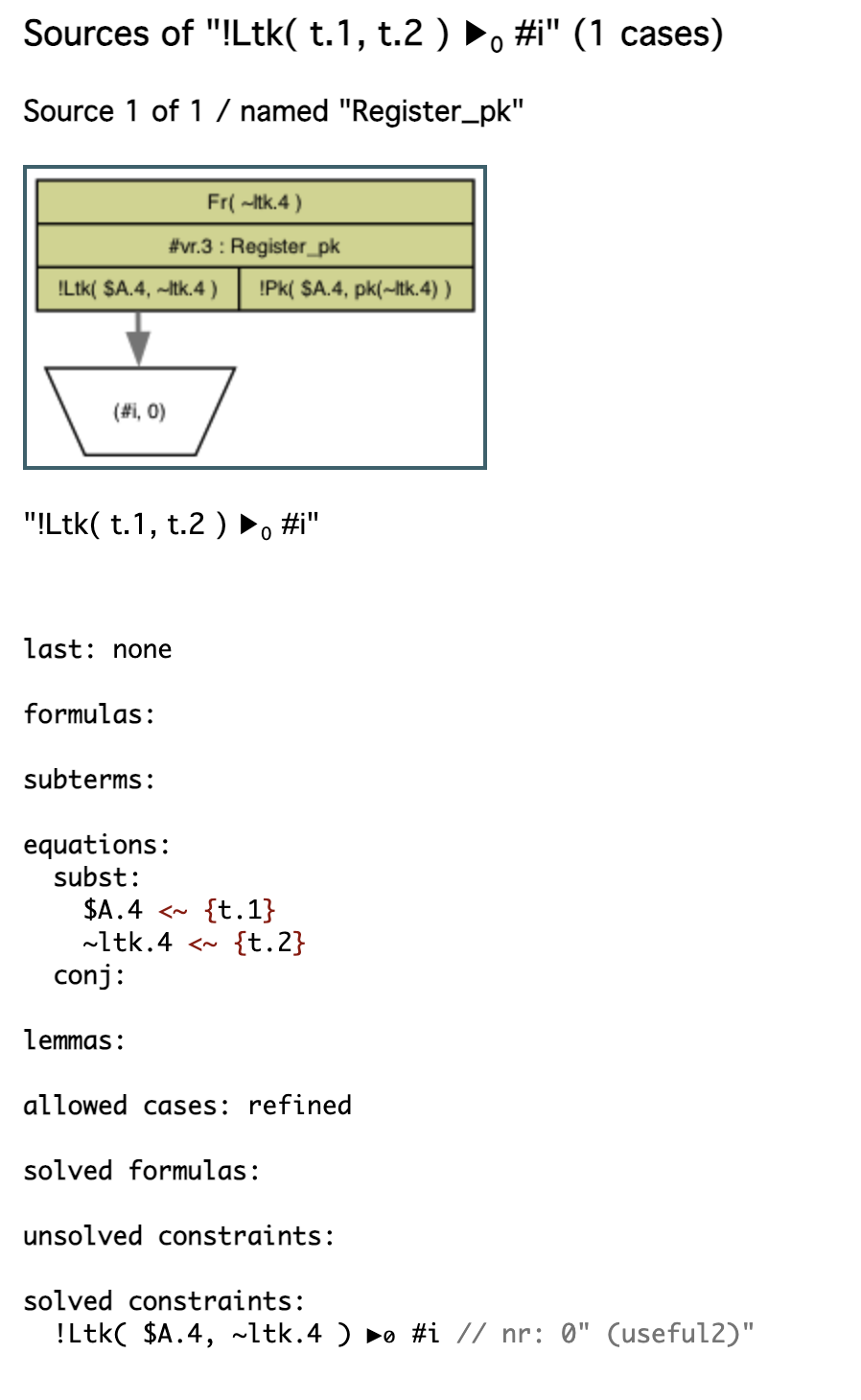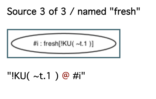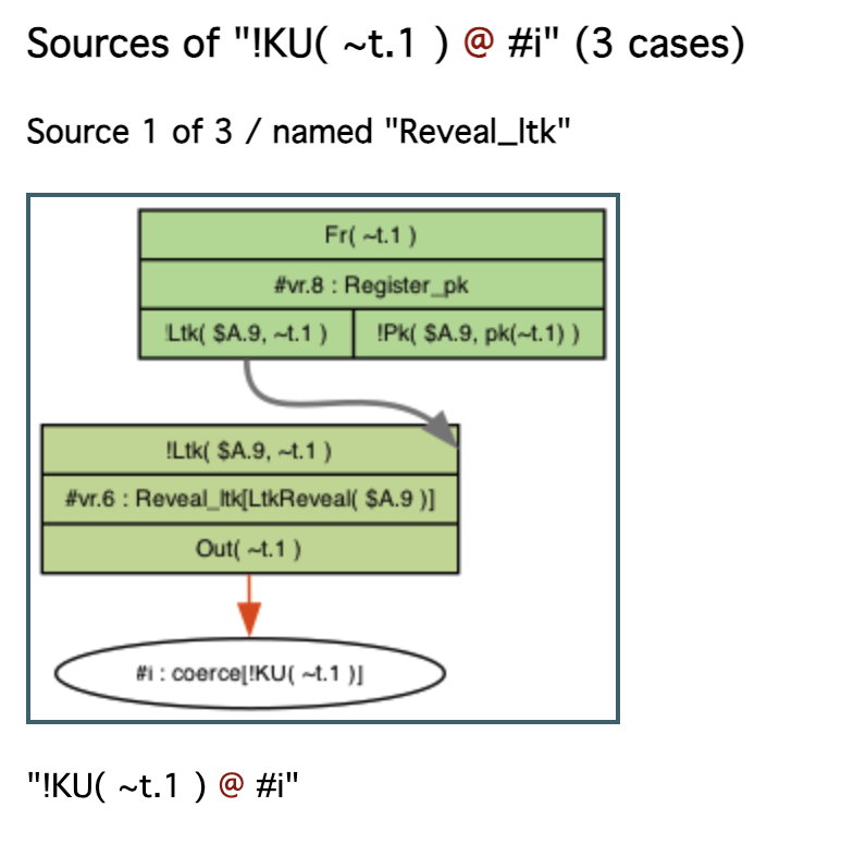3개의 출처(sources)를 가지는 !KU(~t.1) 사실이 있다. 첫 번째는 Reveal_ltk 규칙이다. 이 규칙은 !Ltk 사실을 생성하기 위한 Register_pk 규칙의 인스턴스를 요구한다.