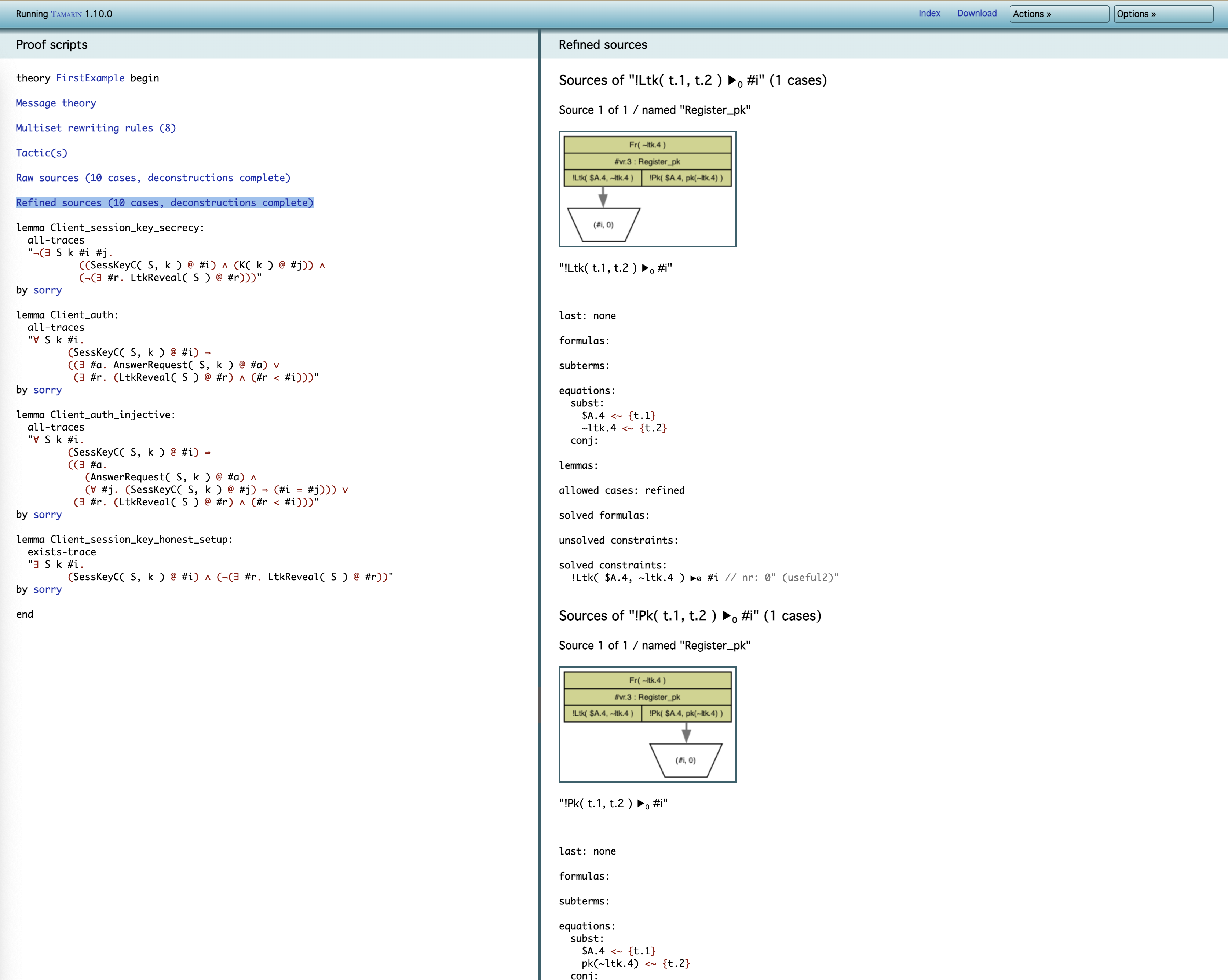 예를 들어, Tamarin은 !Ltk(t.1, t.2) 사실의 가능한 출처가 단 하나뿐임을 알려준다.