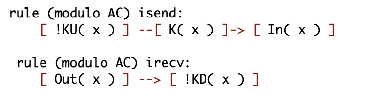 화면의 오른쪽은 프로토콜의 재작성 규칙들과 2개의 추가적인 규칙들:isend, irecv을 볼 수 있다. 이 추가적인 규칙들은 프로토콜의 입/출력과 공격자의 추론 간의 인터페이스를 제공한다.
