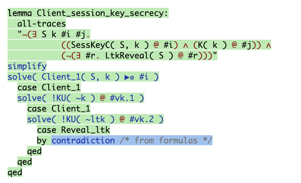 즉, Tamarin은 가능한 모든 시나리오를 분석하여 lemma가 참인지 거짓인지 판별하는 방식으로 보안 프로토콜을 검증한다.