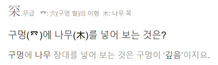 예시 : 심화(深化: 정도나 경지가 깊어짐), 심층(深層), 심해(深海)