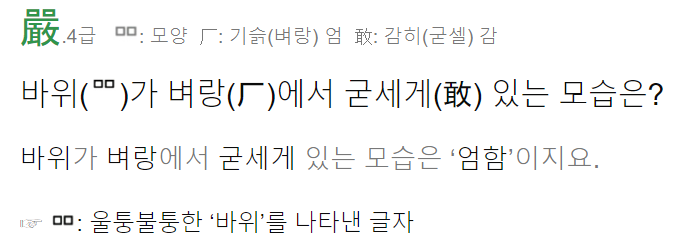 예시 : 엄함(嚴함: 무겁고 딱딱하고 냉정함), 존엄(尊嚴), 장엄(莊嚴)