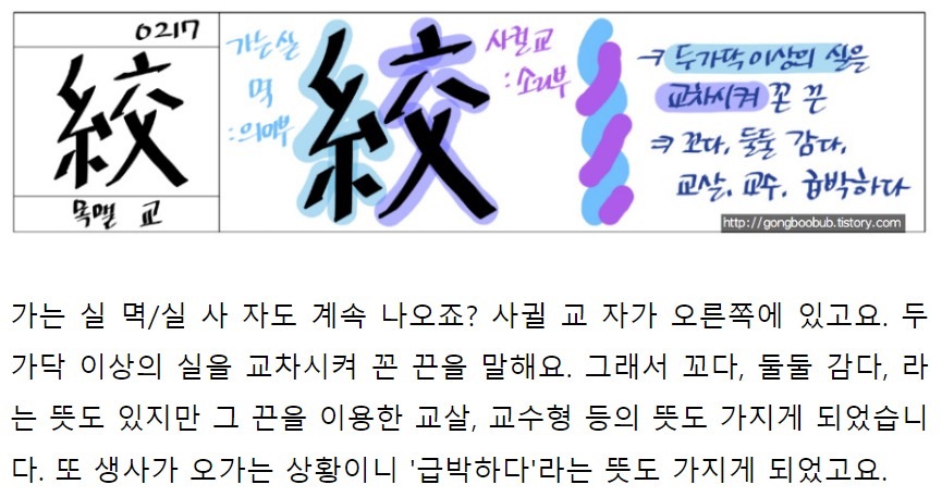 '목맬 교'라는 한자로, '목매다', '비틀어 꼬다'를 뜻한다.