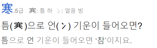 예시 : 한랭(寒冷: 참), 한기(寒氣), 한파(寒波)