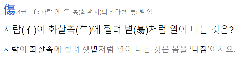 예시 : 상함(傷함: 다침), 상처(傷處), 부상(負傷)