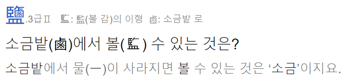 예시 : 염분(鹽分: 소금기), 죽염(竹鹽), 천일염(天日鹽)