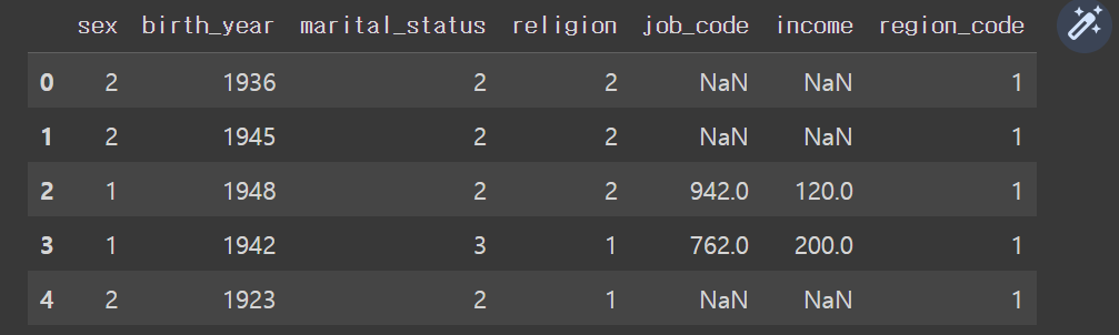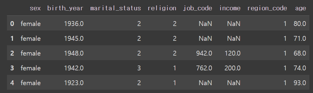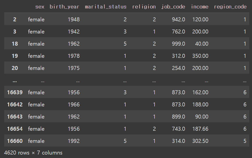 Index(['sex', 'birth_year', 'marital_status', 'religion', 'job_code', 'income',