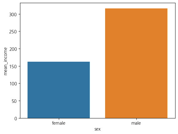 sns.barplot(data=sex_income, x='sex', y='mean_income')