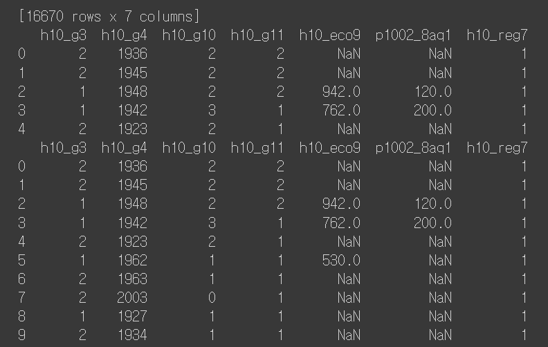 print(welfare) # 데이터프레임은 자동으로 앞부분과 뒷부분을 보여줌