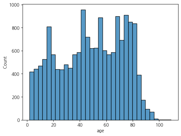 sns.histplot(x = 'age', data = welfare)