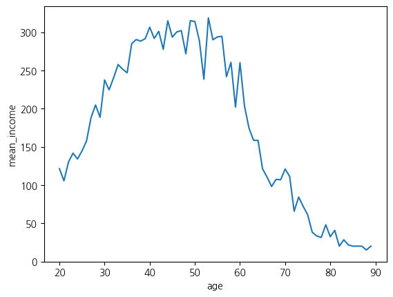 sns.lineplot(x = 'age', y = 'mean_income', data = age_income)