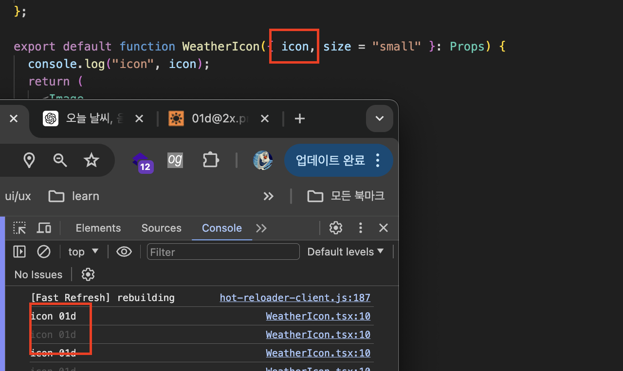 icon이 문제라는 걸 확실히 확인하기 위해서 '01d' 부분도 다시 icon 변수로 넣어서 deploy...