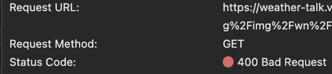 브라우저의 네트워크 탭에서 확인한 결과, 이미지 요청에 대해 400 Bad Request 오류가 발생함.