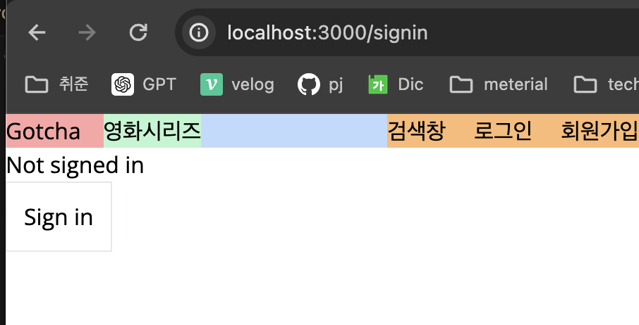로그인 페이지로 왔을때, session이 없으므로 Signin버튼이 나타난다.