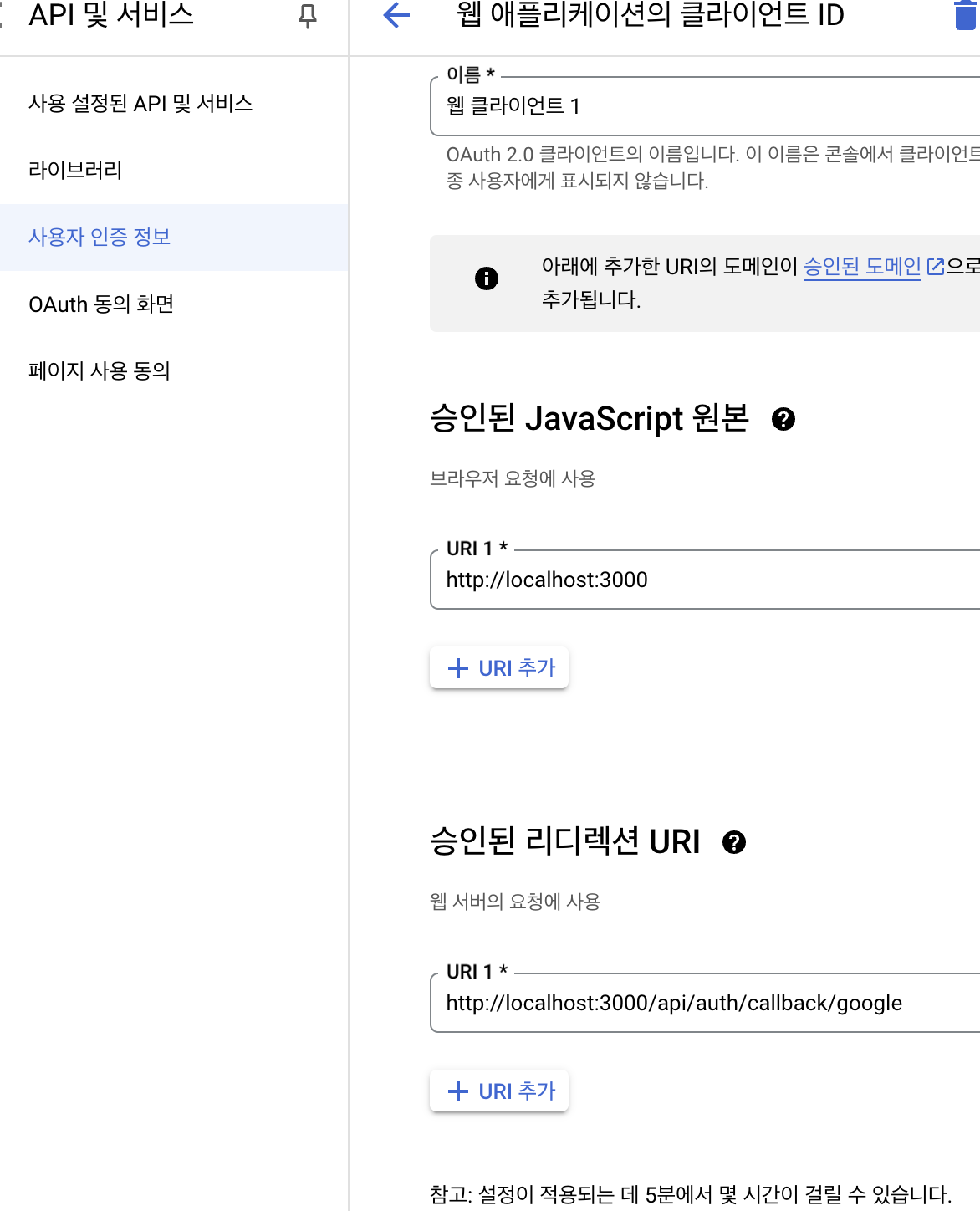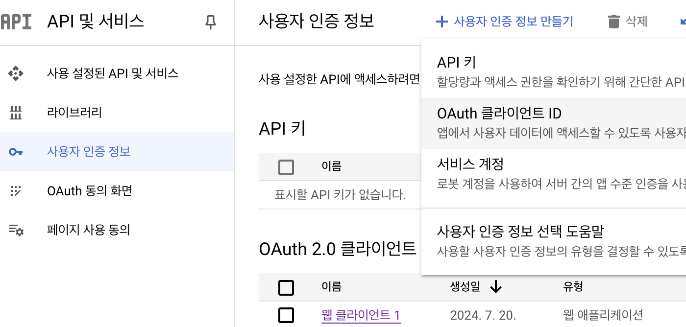 구글 API 및 서비스로 이동 >. 사용자 인증정보 만들기> OAUTH 클라이언트 ID클릭