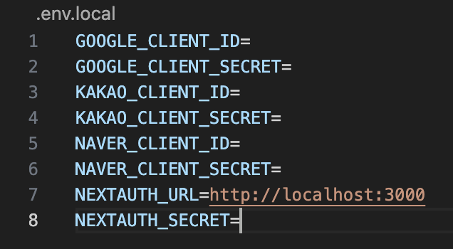 각각 공급자 애플리케이션 설정에서 CLIENT ID 혹은 앱키, SECRET 발급 받아 환경변수 설정해주기(env 설정 후에는 프로젝트를 재시작해야 적용됨)
