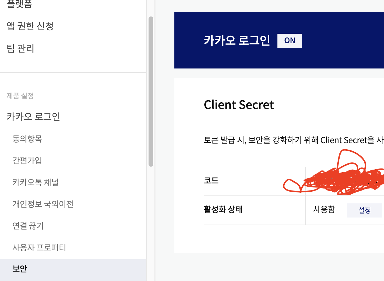 SECRET은 카카오로그인 > 보안 > Client Secret의 코드 확인!