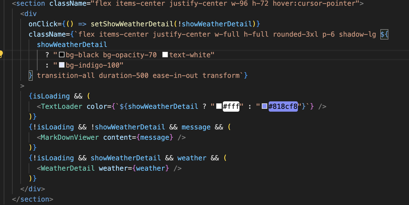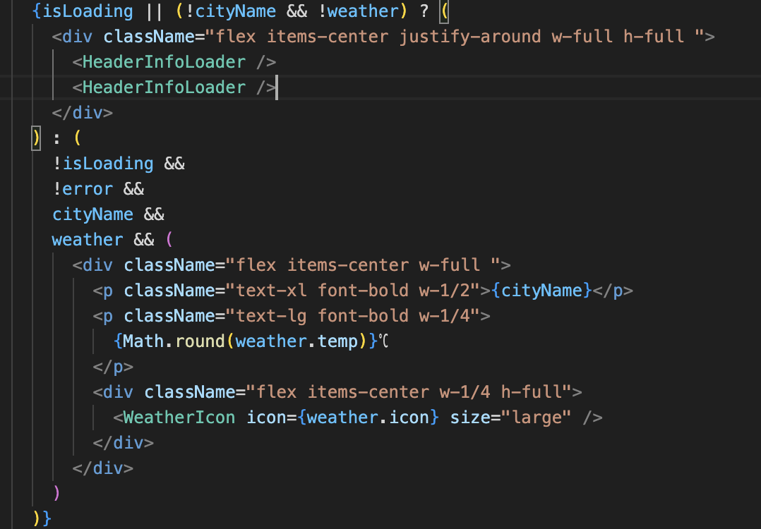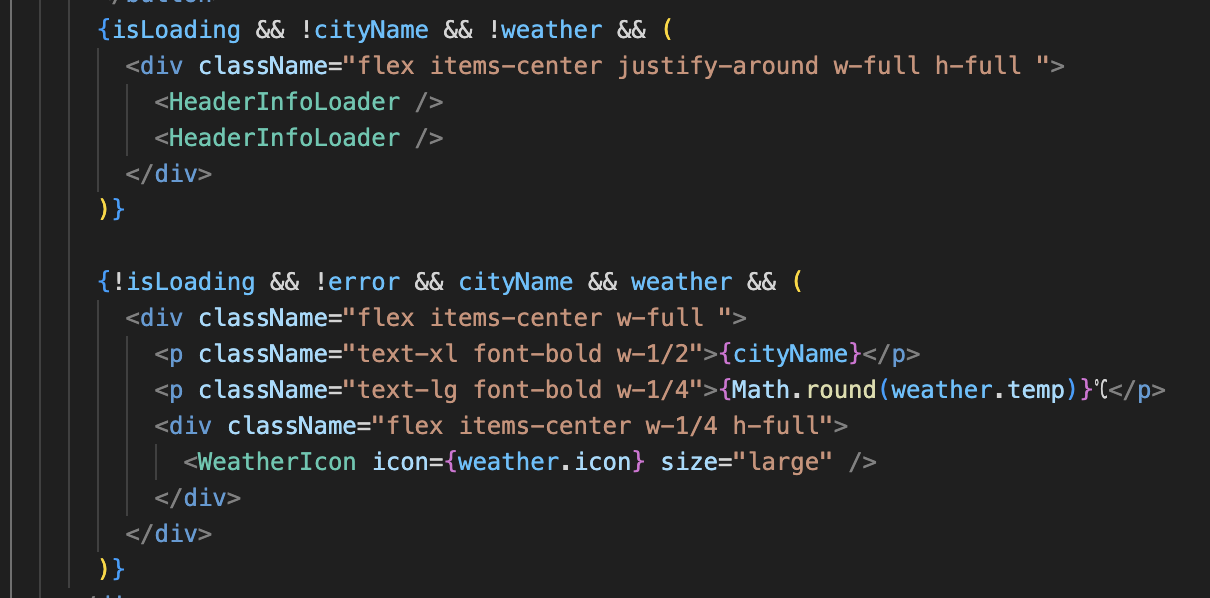 - 원래 코드에서는 isLoading이 true이고(&& 연산자 사용)) cityName과 weather가 없을 때 로딩 컴포넌트를 보여주고, !isLoading, !error, cityName, weather 모두 만족할 때 데이터를 보여줌.