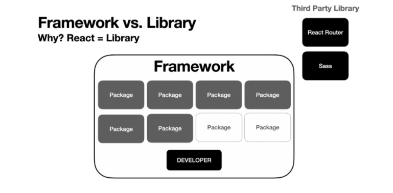라이브러리는 UI를 관리하는 라이브러리, 라우팅에 관련된 라이브러리들, 스테이트를 관리할 수 있는 라이브러리 등. 프레임워크와는 다르게 따로 정해진 골격이 없기 때문에 우리가 원하는 구조의 집을 만들 수 있고, 필요한 기능에 따라 라이브러리를 골라서 사용할 수 있다. UI를 담당하는 것 중에 대표적인 것이 React이다. 개발자가 주체적으로 third-part library를 이용해서 만든다. routing, sass 그래서 필요해서 쓰는 라이브러리이다.