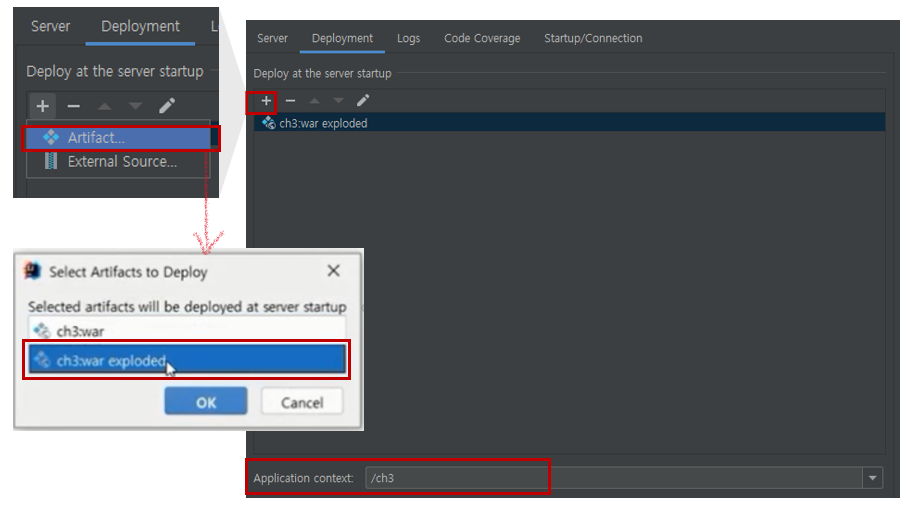 ➌ Deployment → + → Artifact... → ch3:war exploded Application context 설정