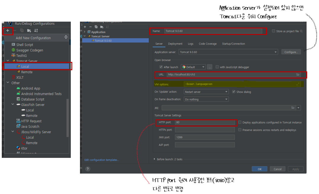 ➋ Name, URL, HTTP port 설정 cf. 로그 글씨 깨짐 방지: VM options | -Duser.language=en