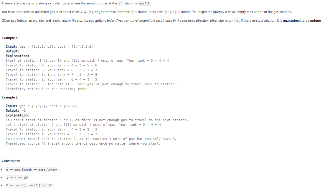 i + 1이 가능한 이유는 처음 if문을 통해서 전체가스 - 전체비용 >= 0인 경우만 고려하기 때문에 마지막 인덱스에 도착했을 때는 반드시 tmp >= 0을 만족해야 함 -> 결과적으로 len(gas) - 1까지의 경우만 생각하므로 ans = i + 1이 성립되게 됨!