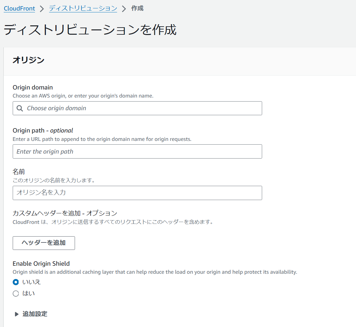 Enable Origin Shield:いいえ (はいの場合費用が発生)