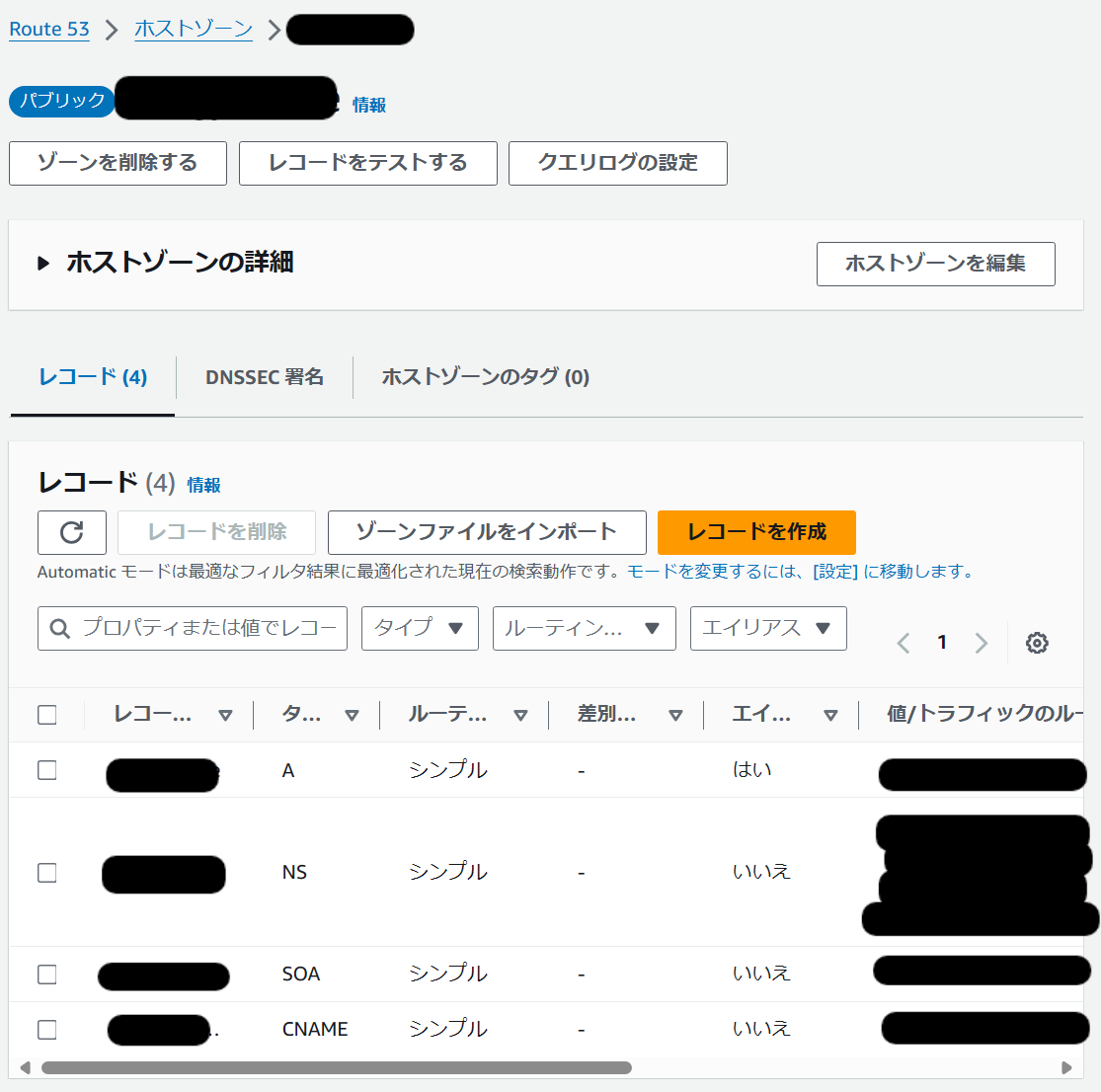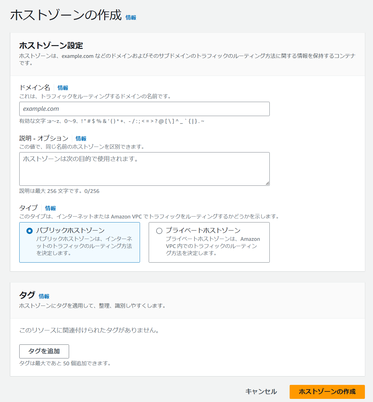 タイプ:インターネットに公開する目的のためパブリックホストゾーンに選択。