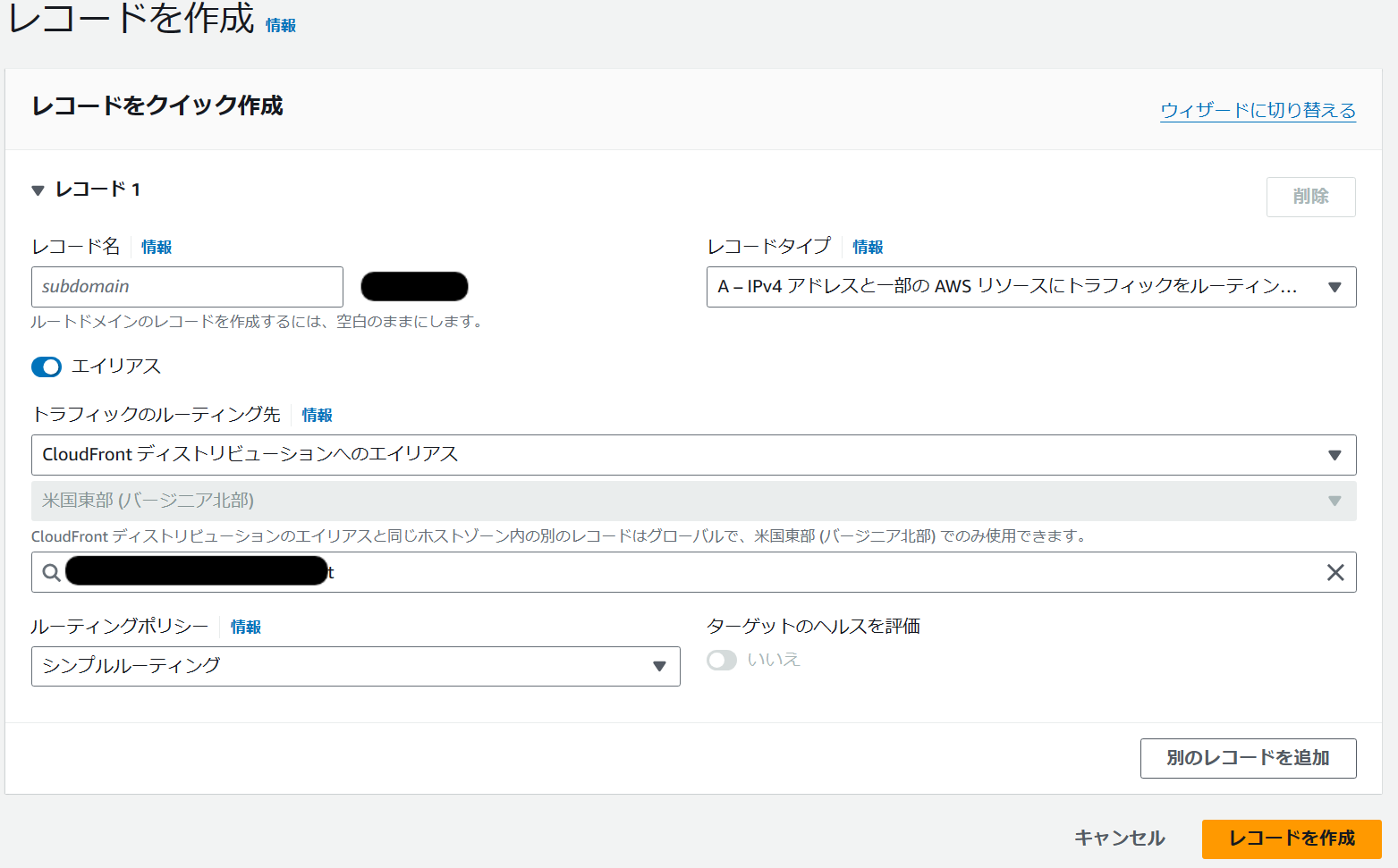 トラフィックのルーティング先:CloudFrontディストリビューションエイリアス