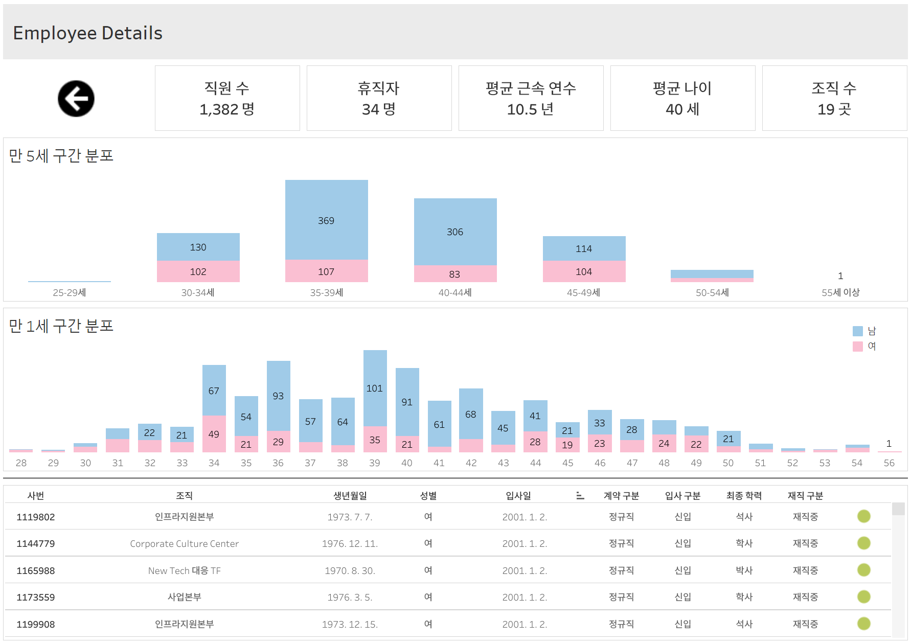 정규직과 계약직의 사번이 다르다. (정규직 1,325명, 계약직 57명)