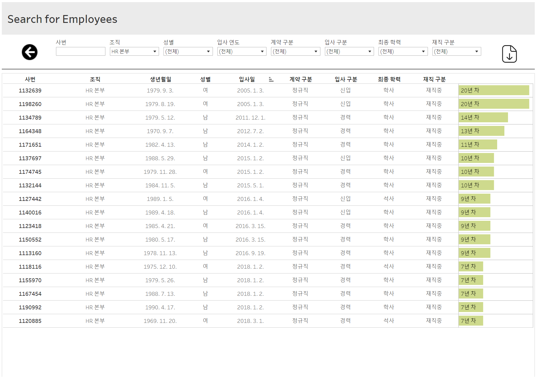 • 조직별 평균 근속연수