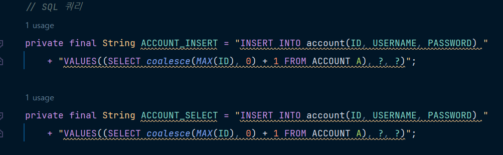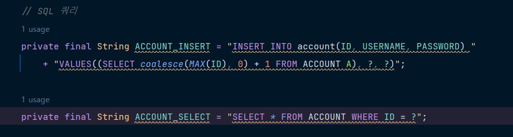 강의를 들으면서 코드를 따라서 치다 보니 놓친 부분이 있었던 거 같다.. 해당 account를 불러오는 ACCOUNT_SELECT 문의 설정이 잘못되어 있었다.