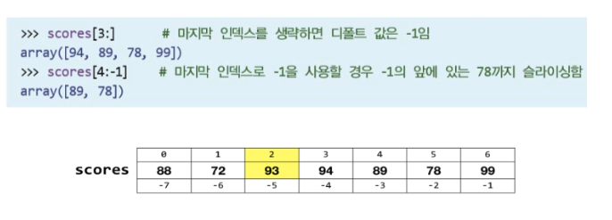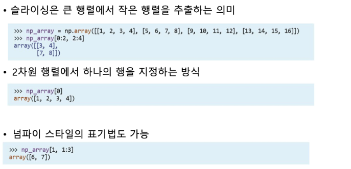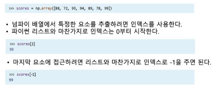 numpy에서 사용되는 인덱싱은 기본적으로 python 인덱싱과 동일. 이때, python에서와 같이 1번째로 시작하는 것이 아니라 0번째로 시작하는 것에 주의.