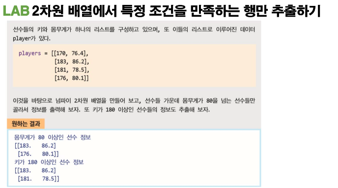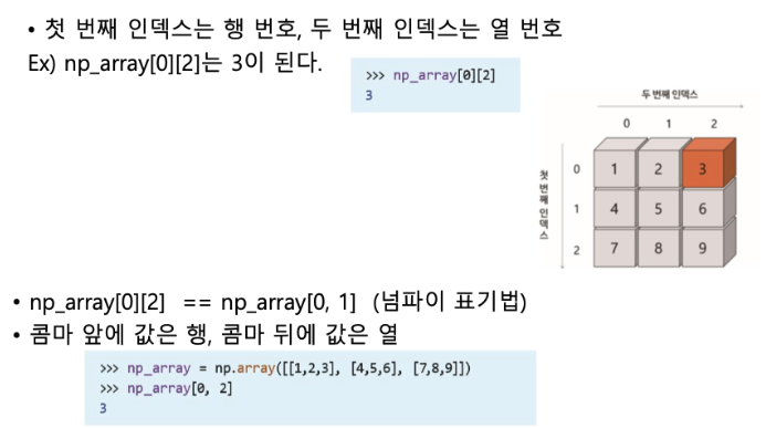 # 2차원의 array 에서 인덱싱을 하기 위해선 2개의 인자를 입력해야 함.