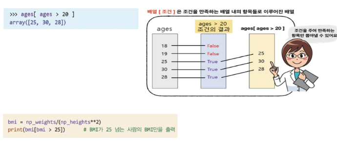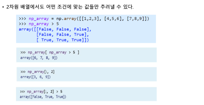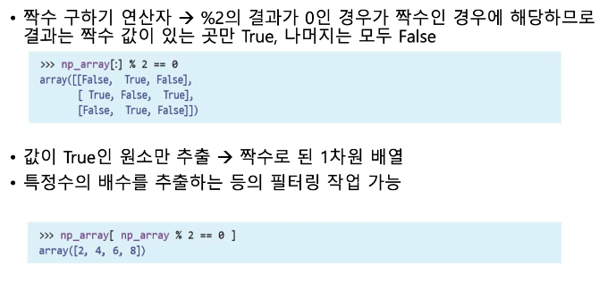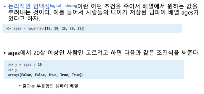위에서 이용한 다차원의 인덱싱을 응용하여 boolean 인덱싱을 할 수 있음. 해당 기능은 주로 마스크라고 이야기하는데, boolean인덱싱을 통해 만들어낸 array를 통해 우리가 원하는 행 또는 열의 값만 뽑아낼 수 있음. 즉, 마스크처럼 우리가 가리고 싶은 부분은 가리고, 원하는 요소만 꺼낼 수 있음.