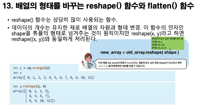 numpy에서는 해당 array의 크기를 알 수 있음. shape 을 확인함으로써 몇개의 데이터가 있는지, 몇 차원으로 존재하는지 등을 확인할 수 있음. 위에서 arr1.shape의 결과는 (5,) 으로써, 1차원의 데이터이며 총 5라는 크기를 갖고 있음을 알 수 있음. arr4.shape의 결과는 (4,3) 으로써, 2차원의 데이터이며 4 * 3 크기를 갖고 있는 array.