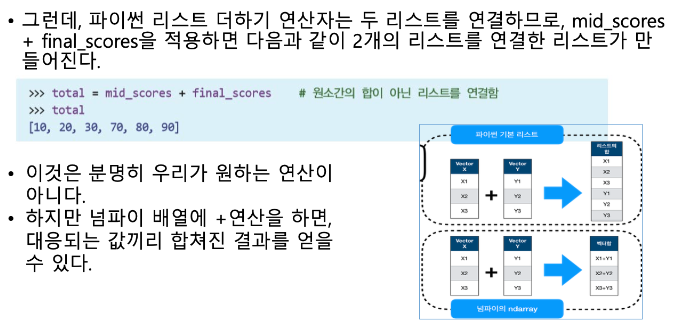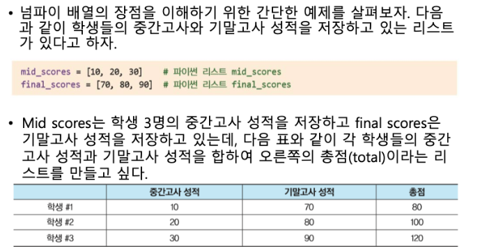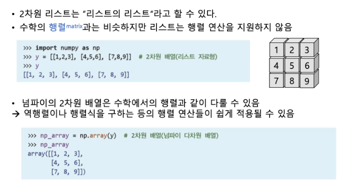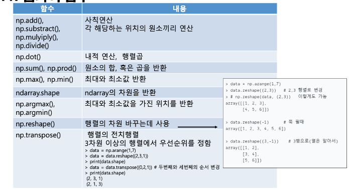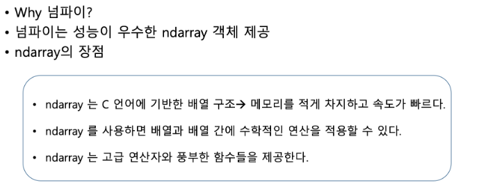 → numpy는 C언어로 구현된 파이썬 라이브러리로써, 고성능의 수치계산을 위해 제작.