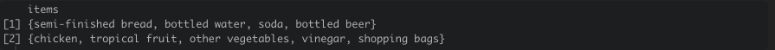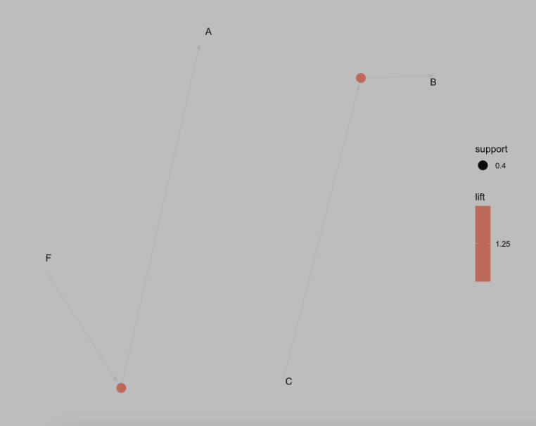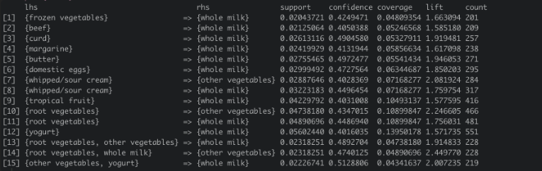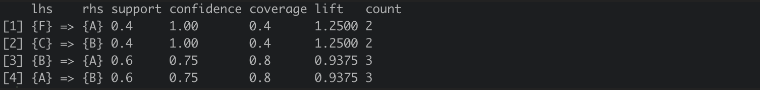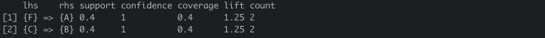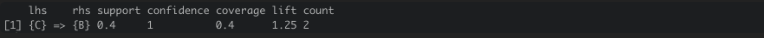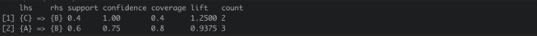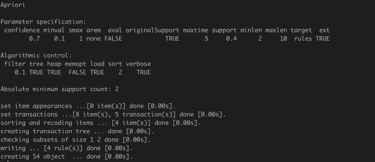 rules = apriori(trans, parameter = list(supp = 0.4, conf = 0.7, minlen = 2))