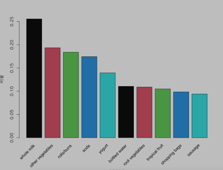 xlab = "상품아이템", ylab = "비율", col = 1:5, topN = 10,family = "AppleGothic")