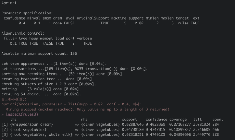 parameter = list(supp = 0.02, conf = 0.4, minlen = 2, maxlen = 3))