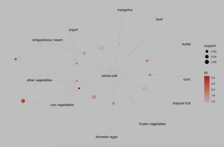 1) "Groceries" dataset에 대한 연관분석 결과를 출력한 그래프 (324쪽의 그래프)를 이미지로 저장하고,