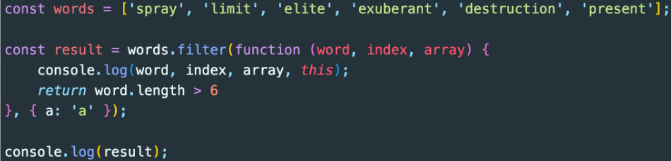 : arr.filter(callback(element[, index[, array]])[, thisArg])
