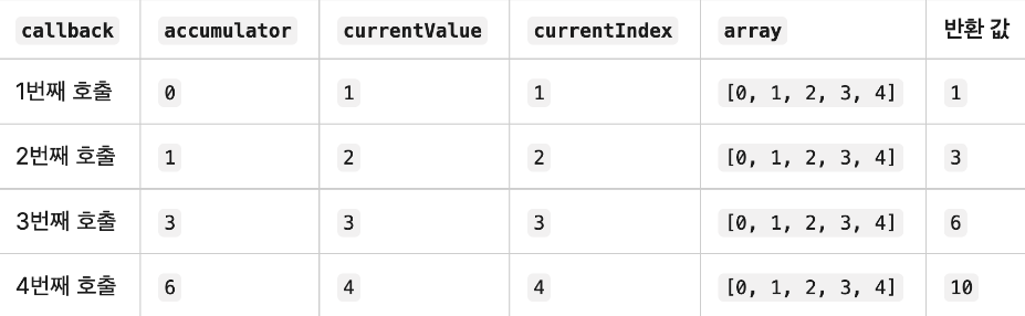 accumulator + currentValue는 accumulator에 저장되어 반환된다.