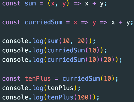 curriedSum 같은 경우 커링으로 x라는 함수 내 y라는 함수로 x + y를 반환하는 구조