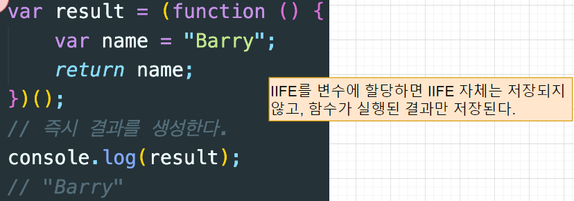 IIFE를 변수에 할당 시 IIFE 자체에 저장되지 않고, 함수 실행 결과만 저장